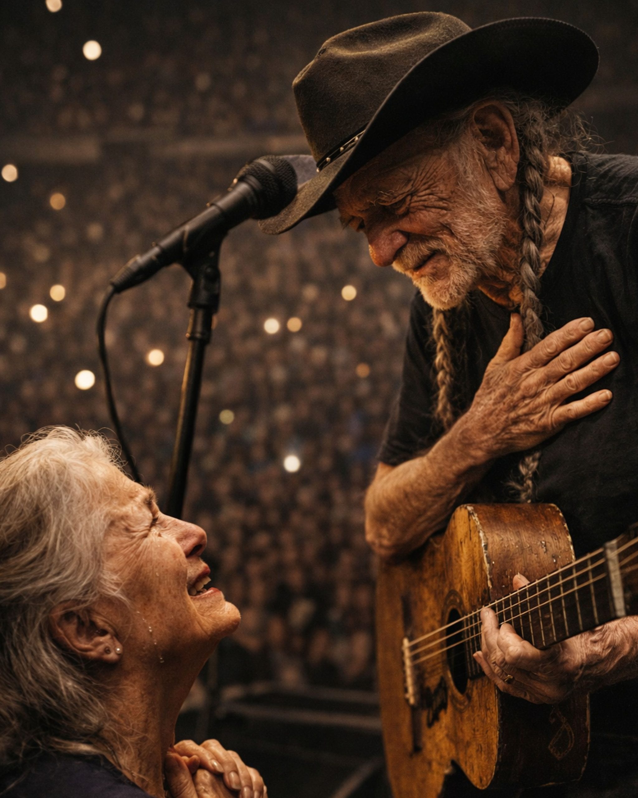 As the song ended, Willie lifted his hand. The band slowed, then stopped. No announcement. No drama. Just instinct. He leaned into the microphone and said softly that the next song was for her.