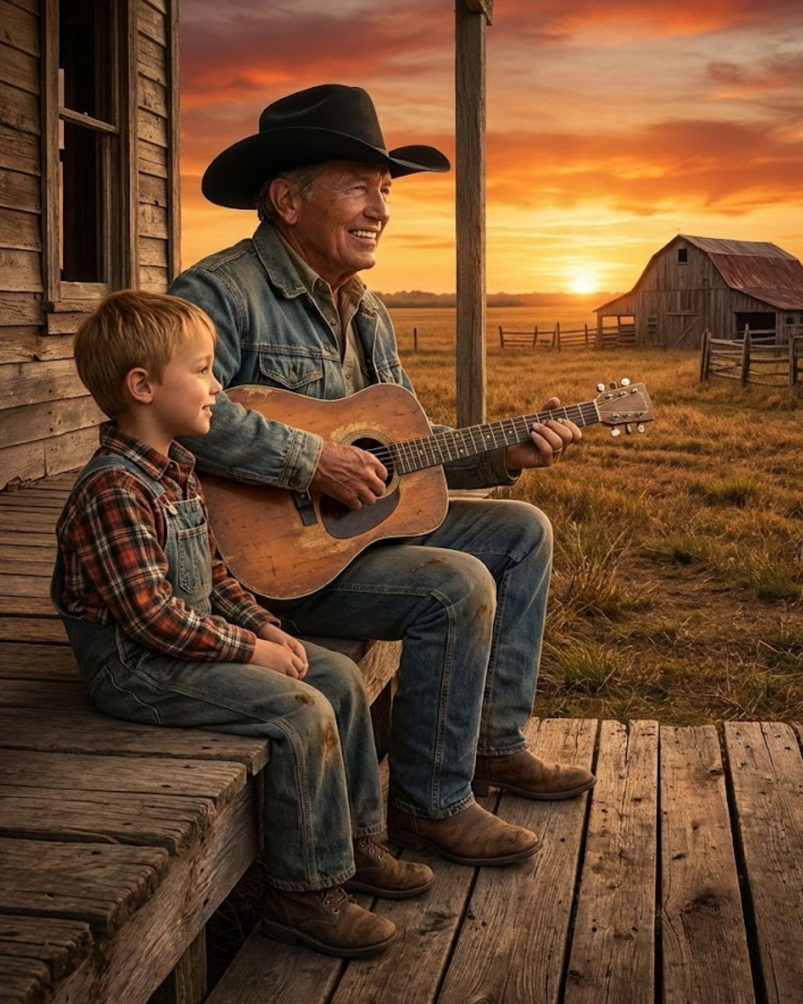 On this particular evening, there are no stadium lights, no encore chants, no crew counting down the seconds. George sits on the worn wooden porch of his old ranch house, a guitar resting easily in his hands. The boards creak when he shifts his weight. A small child—his grandchild—leans against the railing, listening as if every note matters more than the last.