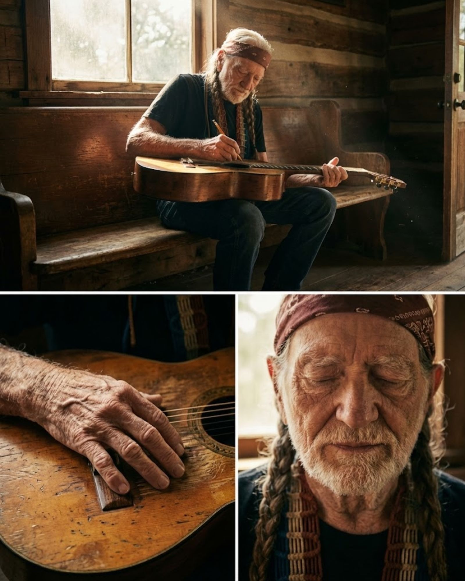 The afternoon was unremarkable by design. No studio clock ticking. No producer hovering. Just a wooden chair by the window, a guitar resting on his knee, and the kind of light that makes dust look like memory. Willie played softly, almost as if he didn’t want the house to hear him thinking.