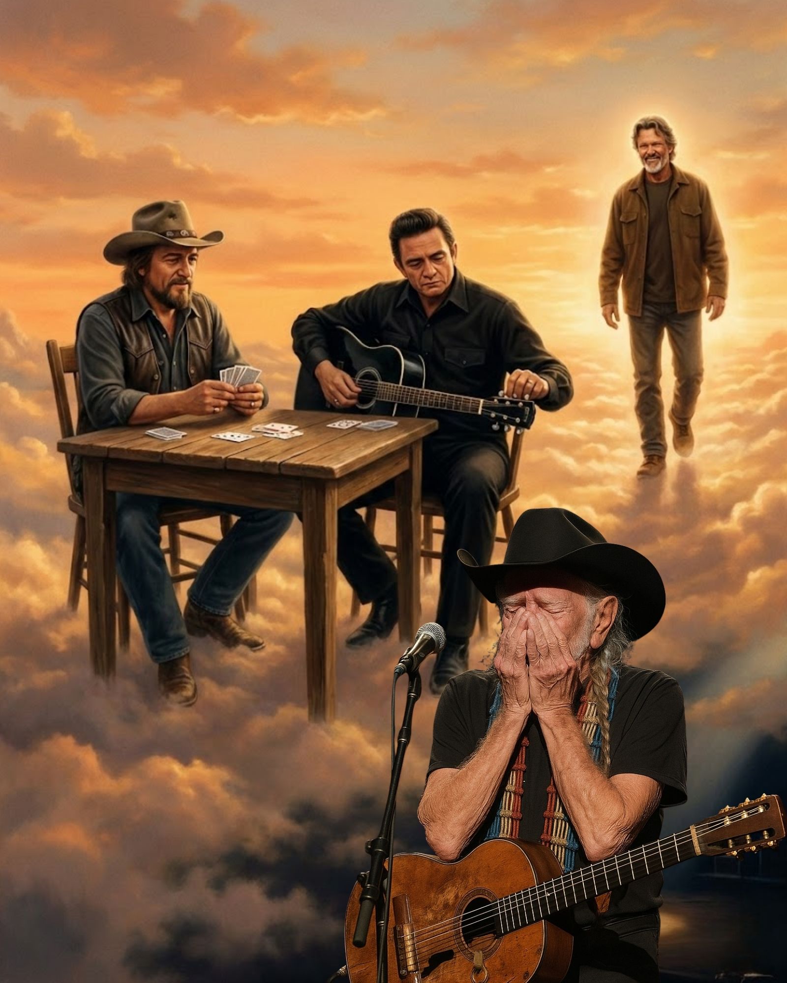 The painting showed a simple wooden table resting on soft white clouds. The kind of table you might find behind a rural bar or in the back room of a roadside café. Seated there was **Waylon Jennings**, calmly dealing cards, his face steady and unhurried. Beside him sat **Johnny Cash**, dressed in black as always, carefully tightening the strings on his dark guitar.