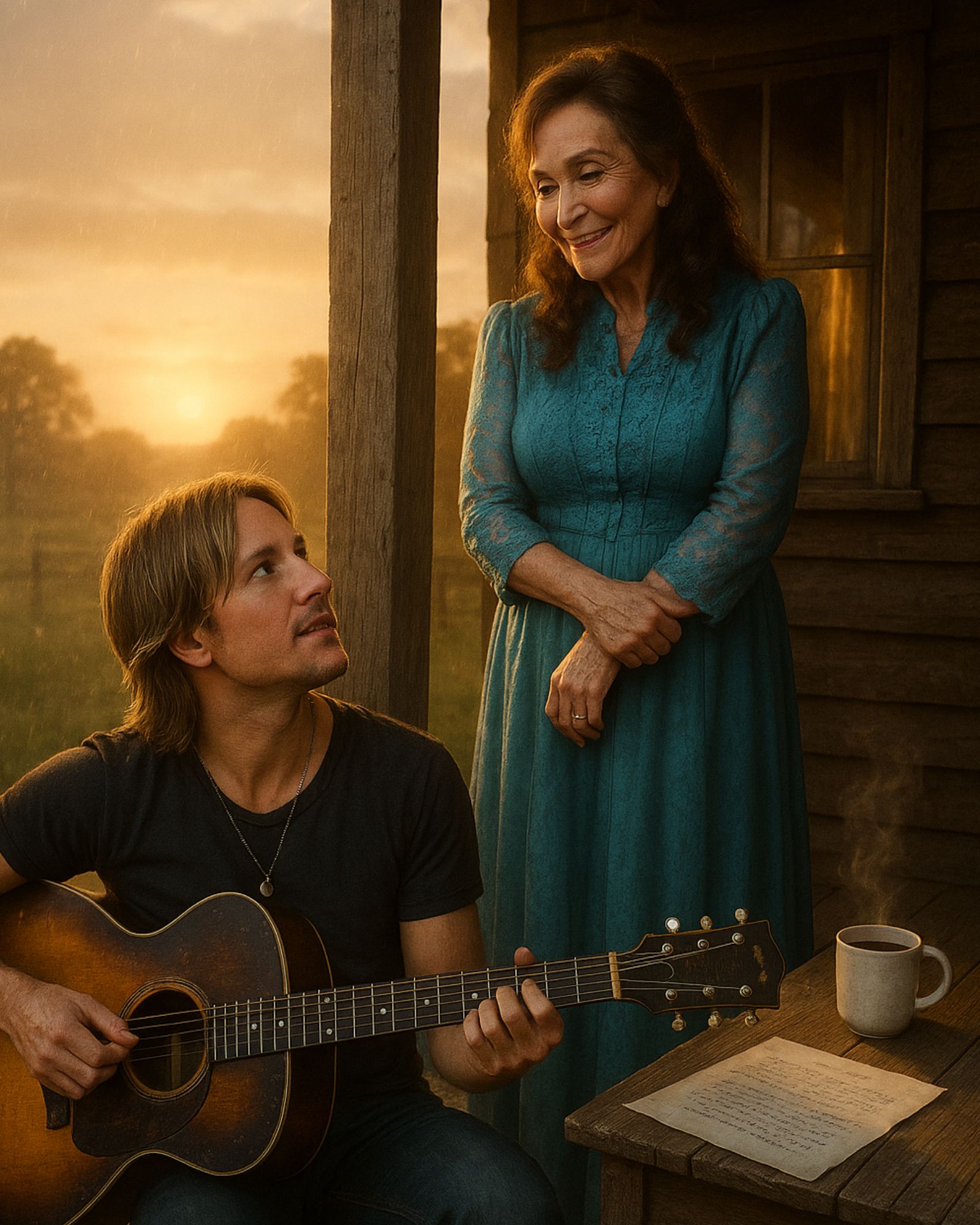 One summer evening in Nashville, years before the world knew his name, Keith Urban found himself on Loretta Lynn’s front porch. The sun was sinking behind the hills, and the air was thick with the smell of honeysuckle and rain. Loretta was sipping sweet tea when she heard it — a guitar solo drifting up the dirt road, wild and tender all at once.
