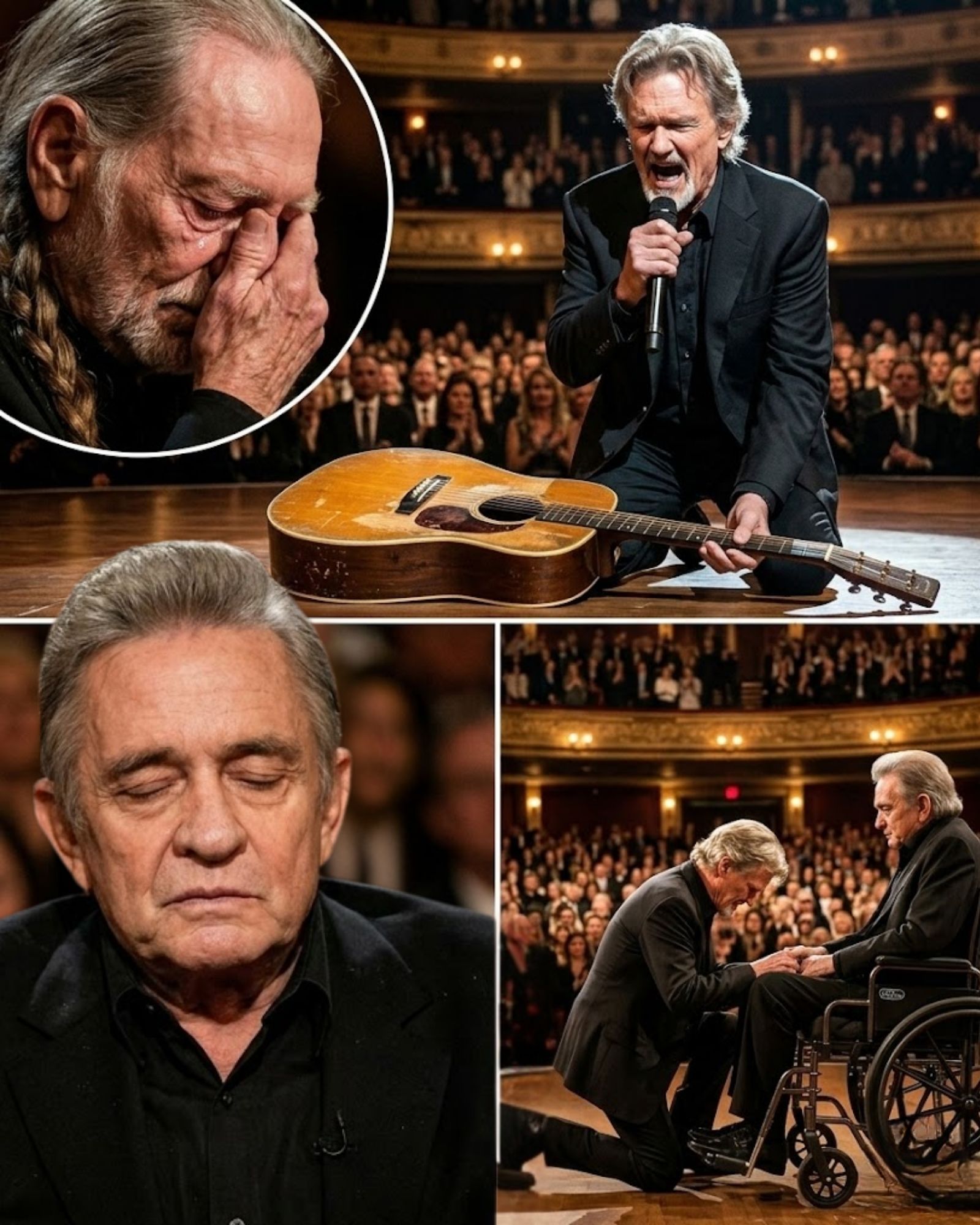 Not with triumph. Not with the proud smile of a performer who knows the room belongs to him. Kris Kristofferson walked with the humility of a man approaching a friend he loved deeply and feared losing. And in front of Johnny Cash’s wheelchair, Kris Kristofferson lowered down onto one knee.