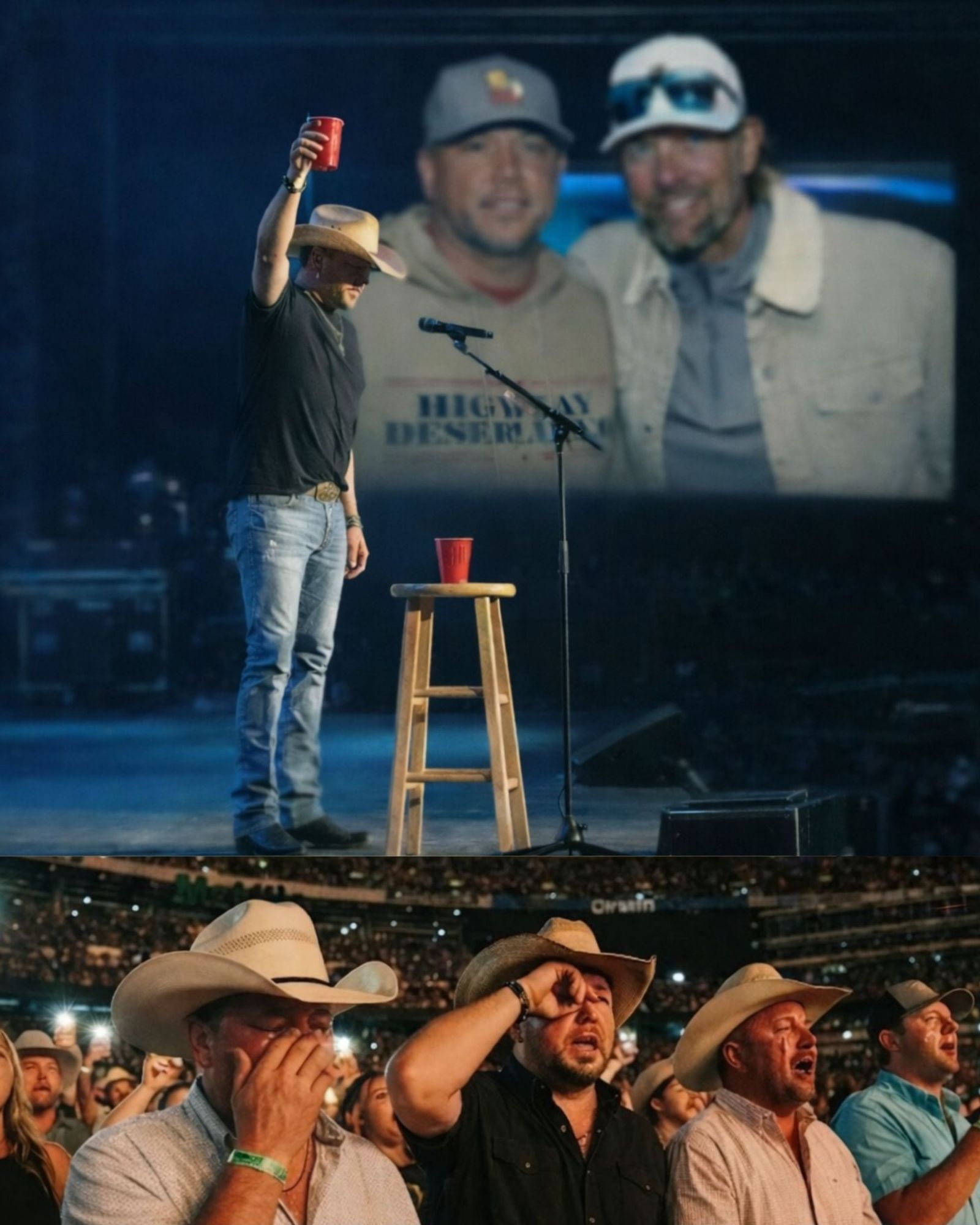 A quiet symbol everyone in the arena recognized without explanation — a nod to Toby Keith, whose humor, swagger, and unmistakable voice once filled rooms just like this.