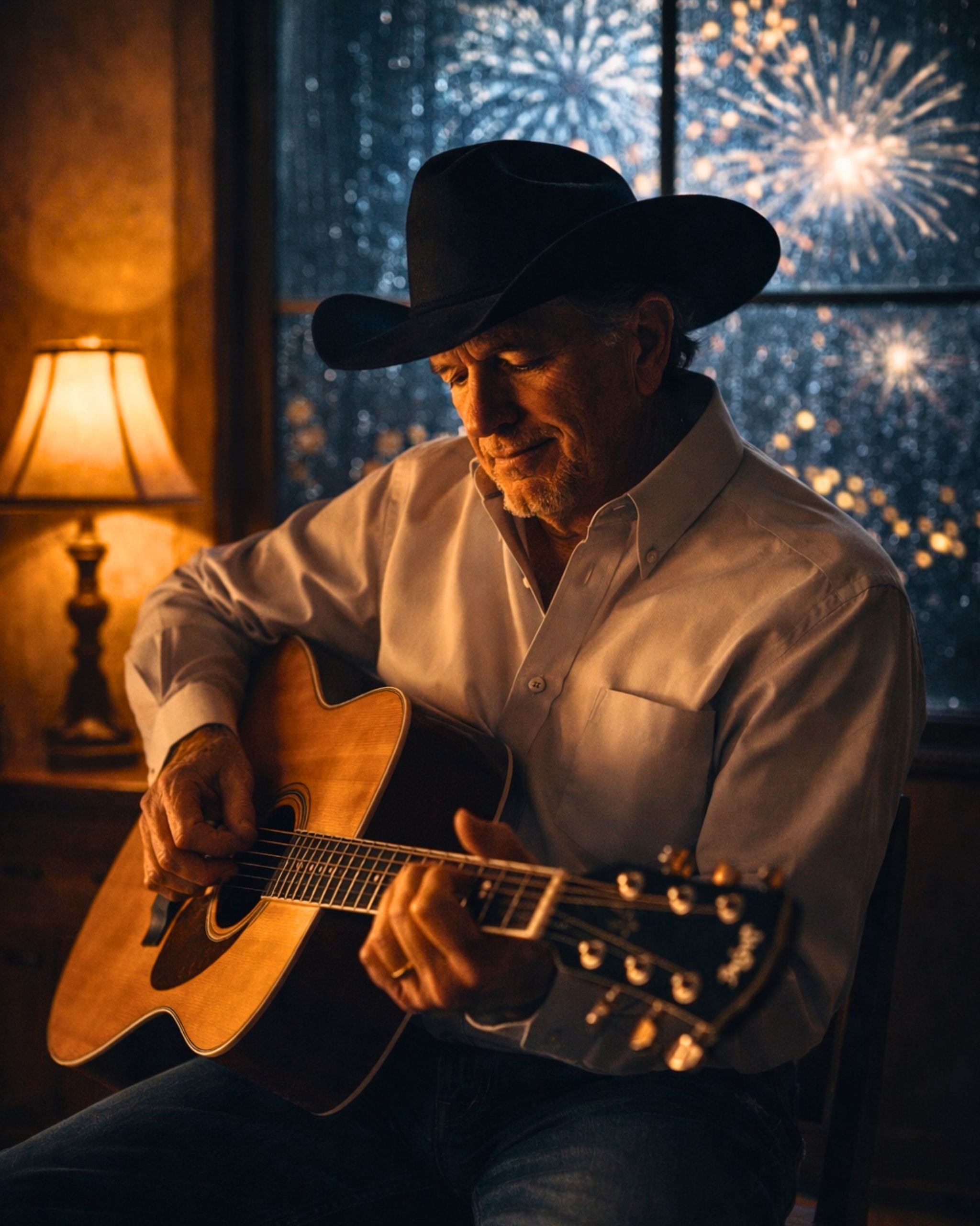 In this imagined story—rooted in the quiet truths his music has always carried—George is backstage at a modest New Year’s Eve show in Texas. Nothing flashy. No countdown clock taped to the wall. Just a folding chair, a guitar resting against it, and the low hum of people waiting for noise outside.