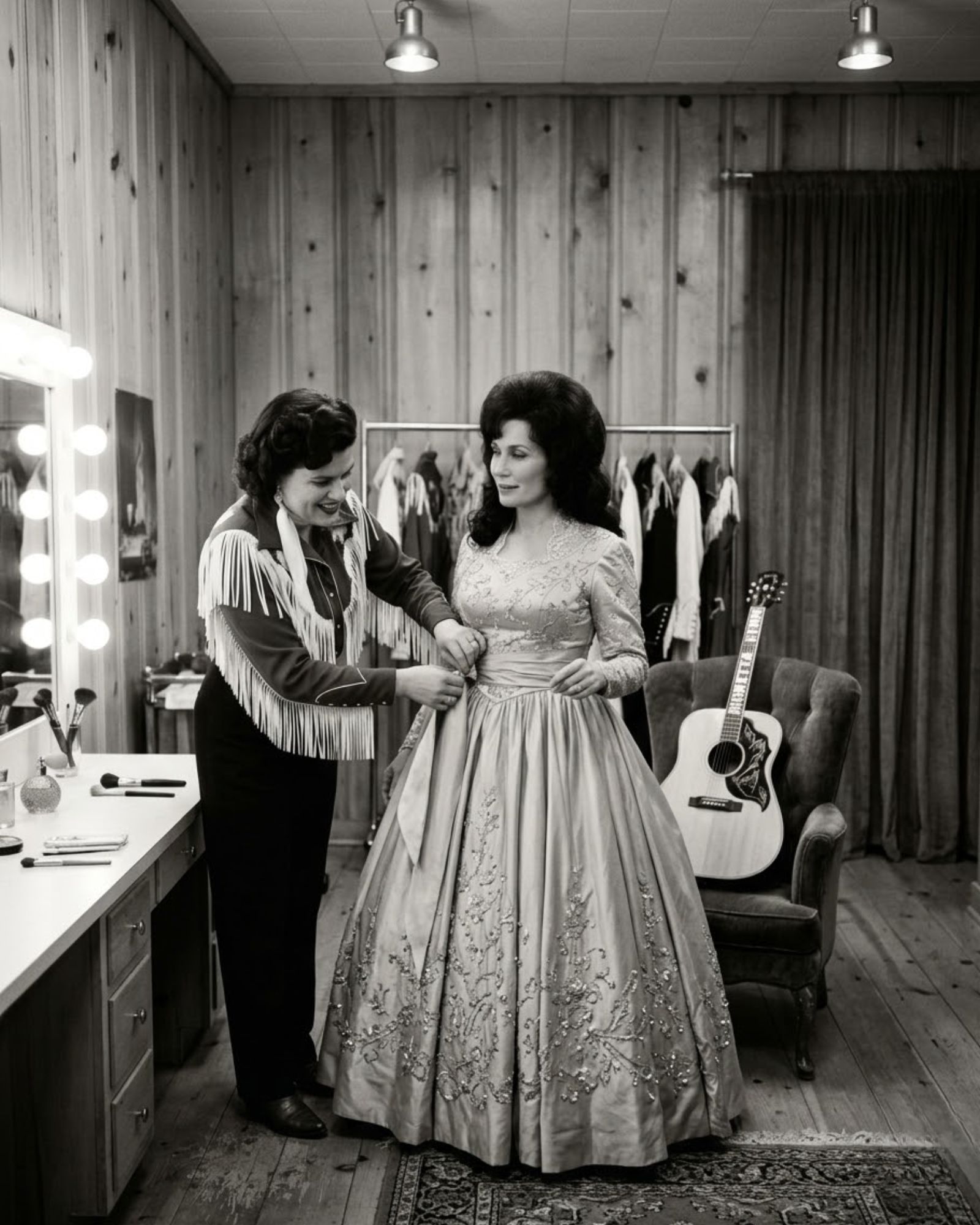 Patsy Cline opened the door to her wardrobe and began pulling out gowns. Beautiful stage dresses filled with sparkle and color. Patsy Cline insisted that Loretta Lynn try them on, helping her understand that confidence on stage sometimes begins with how a singer feels walking out under the lights.