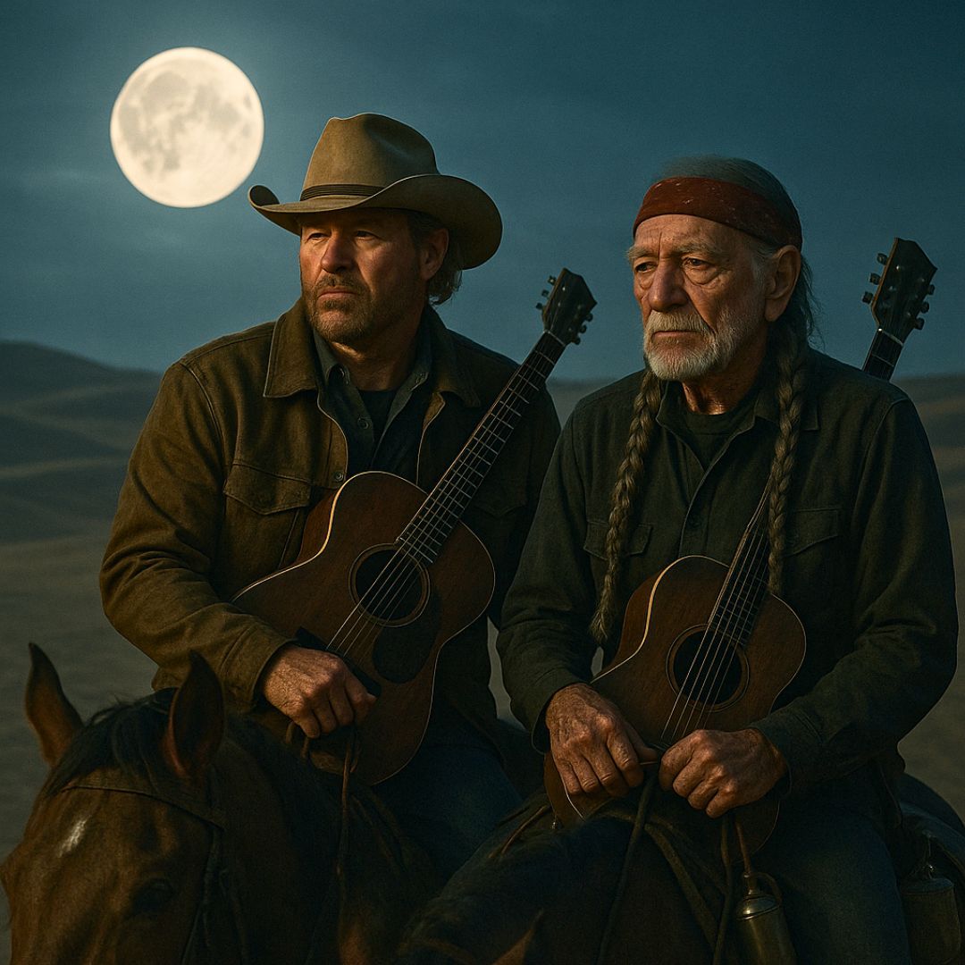 Picture it: under a pale desert moon, two silhouettes emerge. Toby Keith and Willie Nelson ride side by side, guitars on their backs, whiskey flasks clinking in their saddlebags. The night is silent except for the echo of hooves across sand. Then, rising above the wind, comes the chorus we all know: