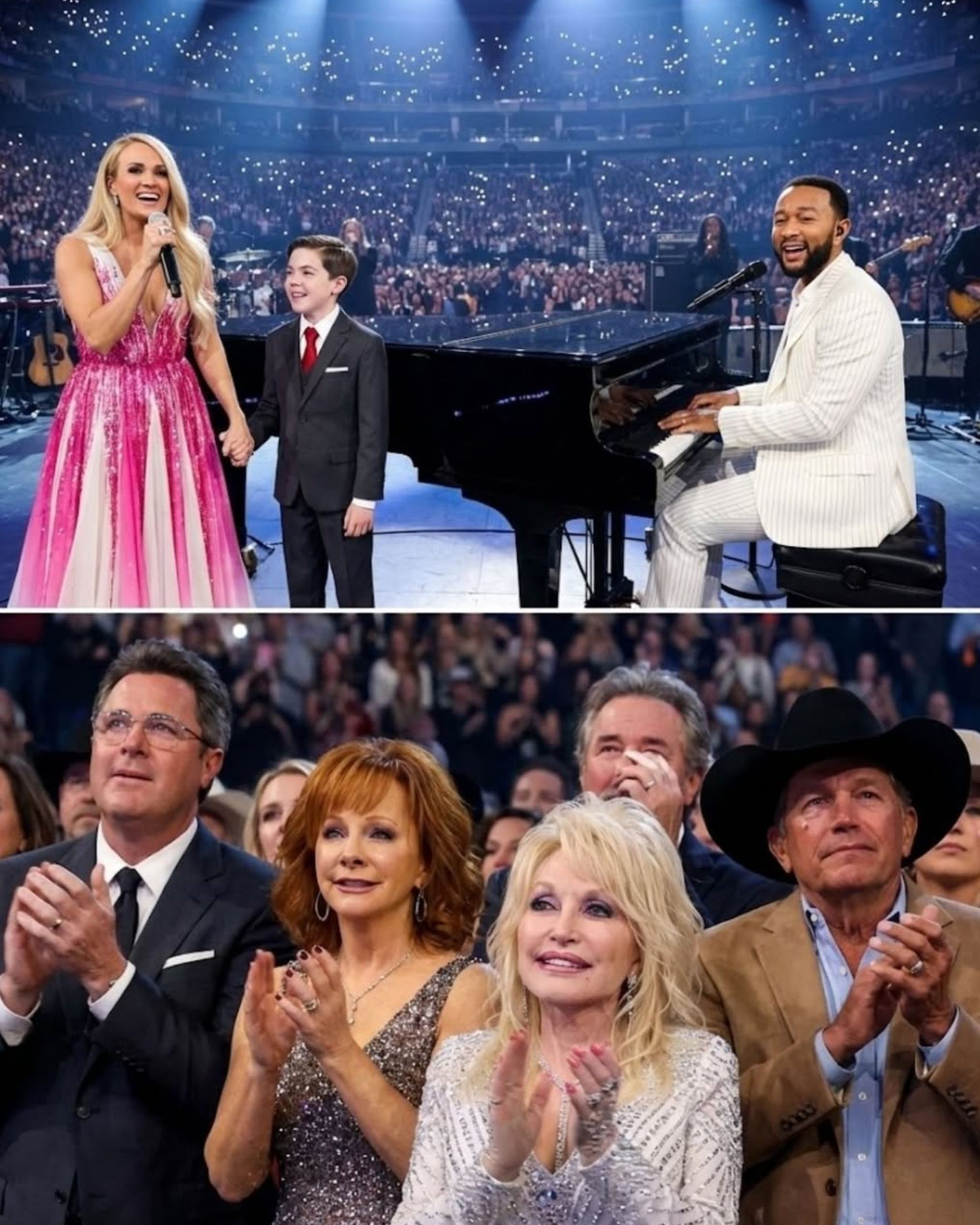 Standing under gentle stage lights, Carrie Underwood didn’t rush into song. With her son at her side and familiar country music legends nearby, she spoke softly about what she hoped for in the year ahead: joy, lasting love, laughter, and healing through music. Her words weren’t rehearsed — they were real. And in that stillness, the night turned sacred.